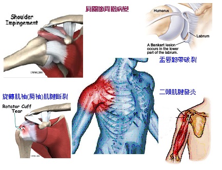 最常見的疾病有:旋轉肌袖肌腱發炎、夾擊症候群(內、外)、沾黏性肩關節囊炎(俗稱五十肩、冷凍肩)、習慣性脫臼(盂唇病變);常見的症狀為疼痛無力、活動度受限及不穩定。傳統的手術為切開外面的肌肉再探查肩關節內的病變,恢復時間除了要等病變部位還要等破壞的肌肉(如三角肌)恢復,復健的時間較久。若是通過肩關節鏡微創手術,就沒有破壞肌肉的問題,恢復時間較快,住院時間短,為目前先進國家運動醫學的主流。