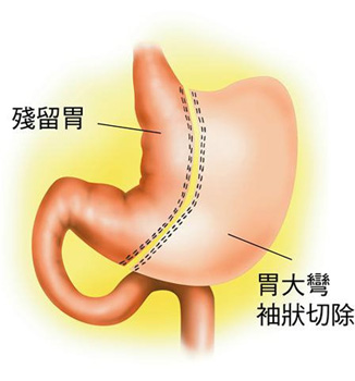 袖狀胃切除手術(胃縮手術)是指移除約75%80%的胃,留下一個窄胃 "管" (袖狀胃)。利用減少胃容積及減少促食慾賀爾蒙 (Ghrelin) 的原理限制食量,達到減重效果。