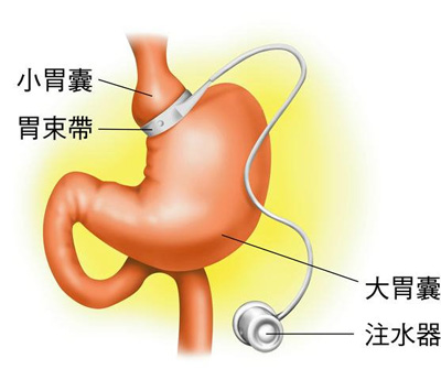 胃束帶是一個矽膠的環狀束帶,經由在胃部上方裝置約束帶形成 25 c.c.小胃囊,同時經由置於皮下的注射調節器來調整束帶開口的大小,以控制進食量,進食後食物容易在胃囊會產生飽足感,可減少食量以達到減重效果。胃束帶手術的原理是經由類似約束帶的裝置將胃部上方約束,同時經由置於皮下的注射器來調整束帶鬆緊度以調整可進食量。因為不切割腸胃道,是目前醫界認為最安全的減重手術方法。