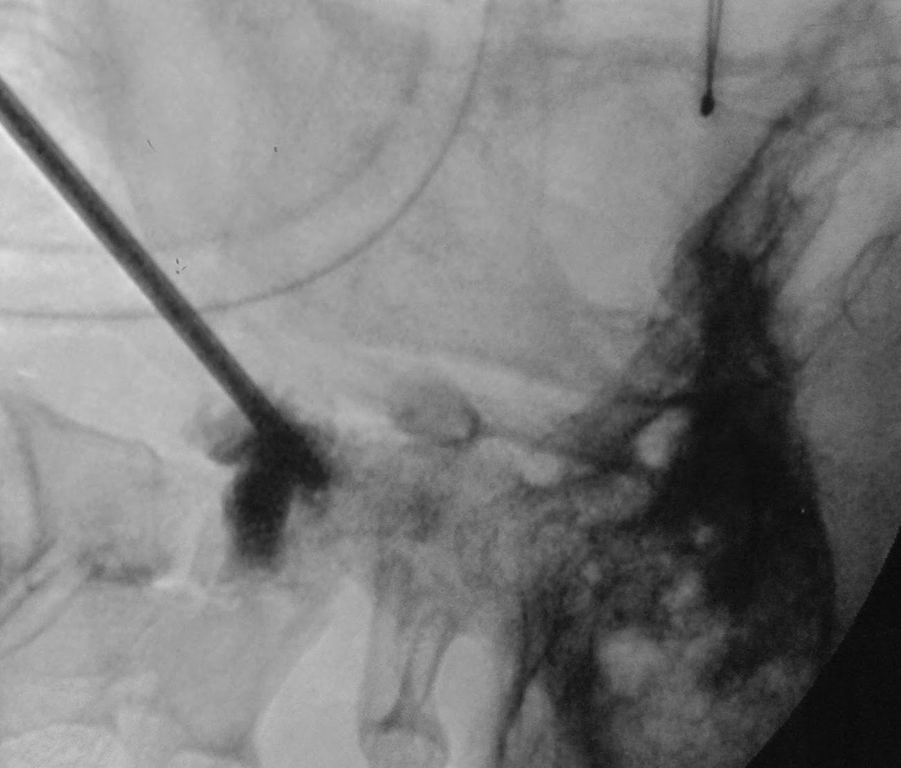 圖一: 穿刺針刺入頸椎骨折的脊椎骨