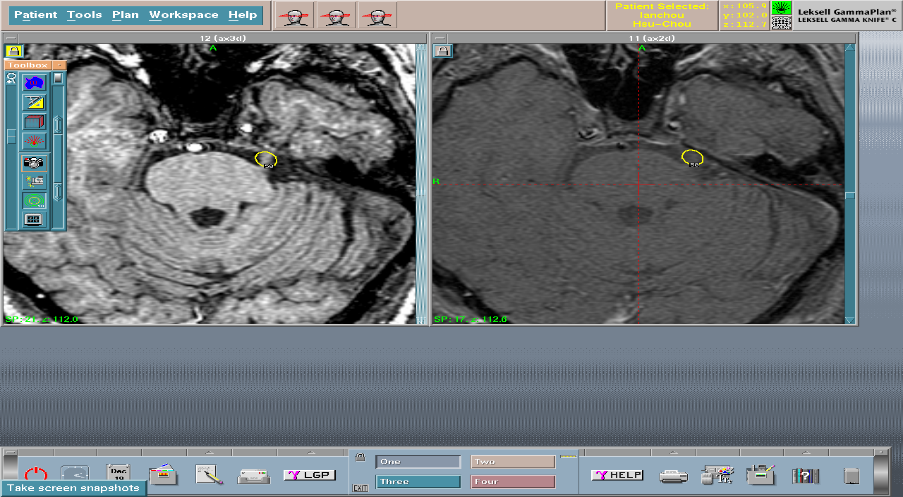 * 手術當天早上: 病患由病房送至加馬刀治療中心,先安置頭部立體定位頭架,再接受影像學檢查(磁振造影掃瞄MRI或電腦斷層掃瞄CT或血管攝影檢查Angiogram),檢查完畢後,再送回加馬刀治療中心。由治療小組利用影像學檢查結果,以精密的電腦程式 (Gamma Plan),設計完整的放射治療範圍及劑量。病患接受加馬刀放射手術治療。